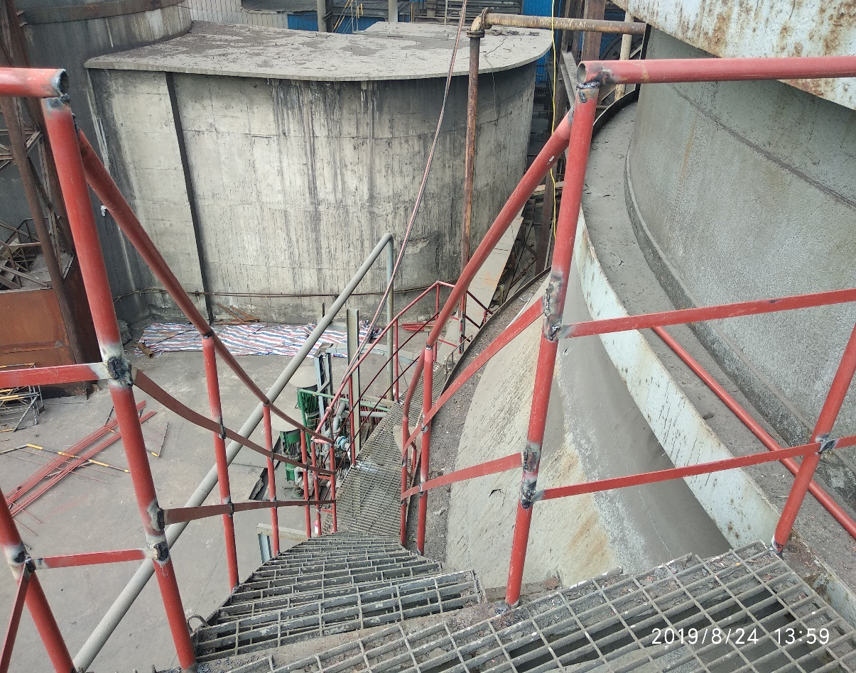 內(nèi)江藍(lán)鼎自接手運(yùn)維工作以來,在實(shí)際生產(chǎn)運(yùn)行中發(fā)現(xiàn)了許多安全隱患,其中燒結(jié)1#2#脫硫塔上塔梯步腐蝕嚴(yán)重,人員上下塔存在嚴(yán)重安全隱患,為保障人員安全,生產(chǎn)部決定將1#2#脫硫塔上塔梯步平臺進(jìn)行全面修復(fù)更換,拆除嚴(yán)重腐蝕的護(hù)欄、平臺,安裝新護(hù)欄、平臺。