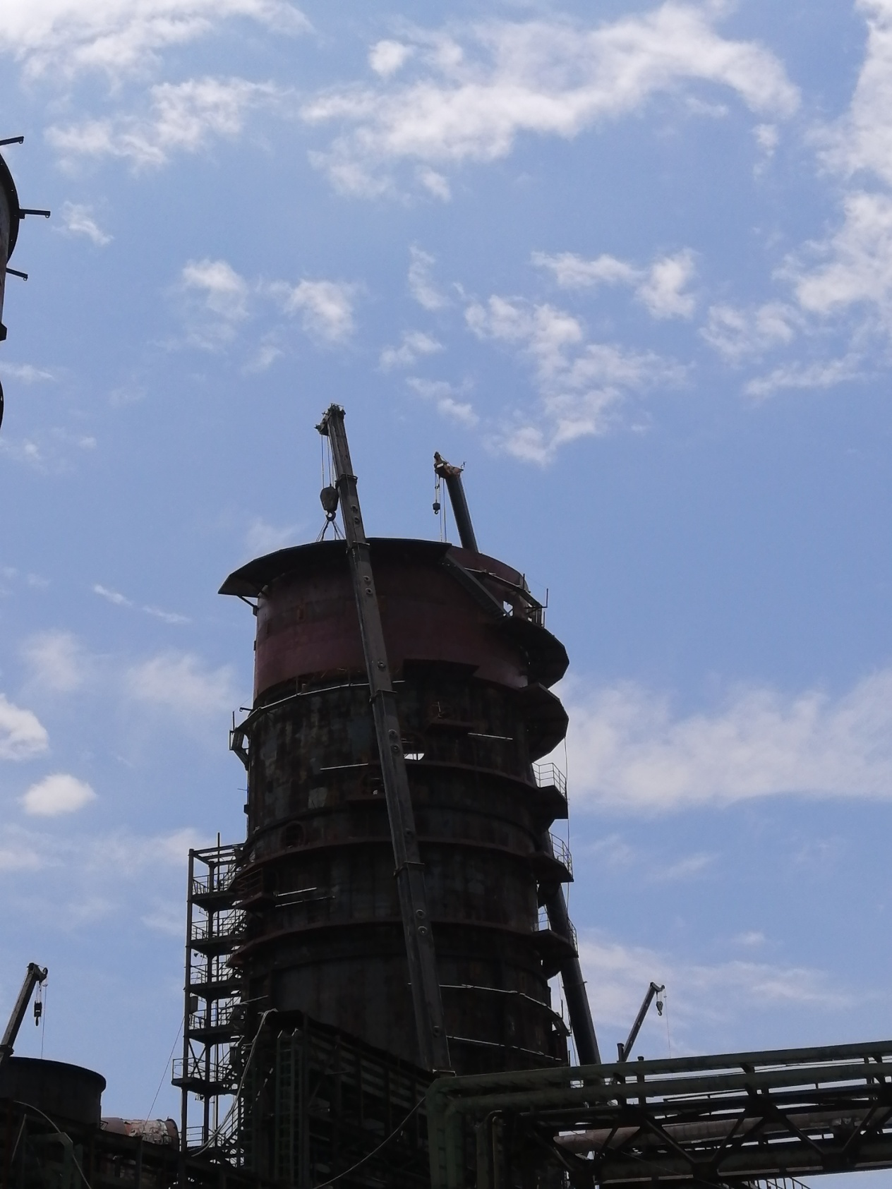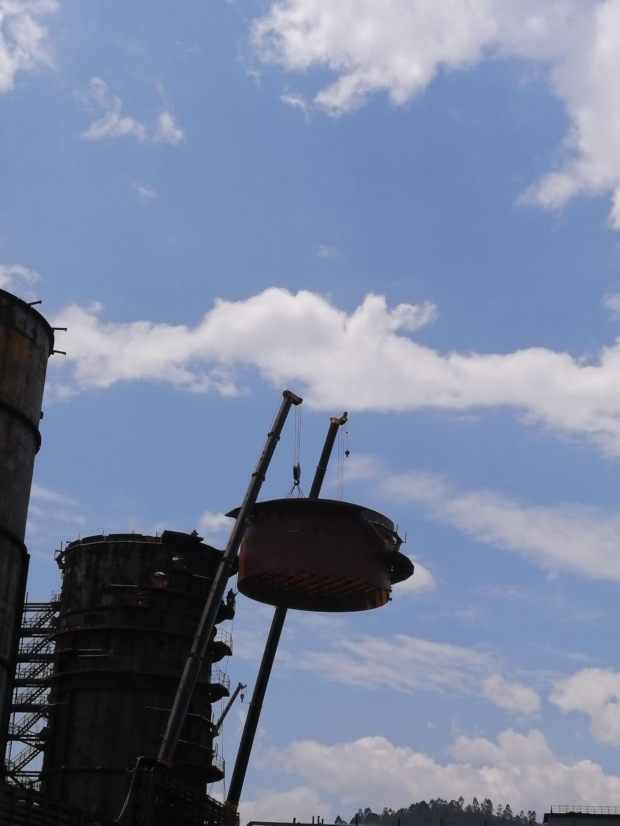 6月1日天氣晴朗,風(fēng)力1級,具備良好的施工條件,7:10分兩臺180噸的吊車準(zhǔn)備就緒,吊裝人員系好了吊繩,技術(shù)員確定吊裝位置,安全員仔細檢查吊繩是否完好,各項工序準(zhǔn)備就緒,指吊員準(zhǔn)確指揮兩臺吊車同時起吊,12:30分56噸重的除霧器鋼結(jié)構(gòu)吊裝到位,穩(wěn)穩(wěn)的焊接在脫硫塔頂部。此次除霧器鋼結(jié)構(gòu)的成功安裝為10月31日順利投產(chǎn)奠定了堅實的基礎(chǔ)。