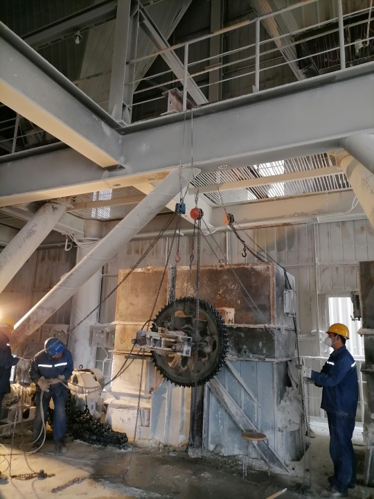 8:16分檢修班長王成東安排人員立即準(zhǔn)備檢修工器具,并聯(lián)系中控室人員正常拉料停E2斗提,10:40分E2斗提停機,電工立即停電掛牌,檢修人員開始檢修工作。要更換E2斗提頭輪軸承,必須先把E2斗提的雙排鏈輪整體撤下,但是普通拉馬根本無法將直徑1.5米的雙排鏈輪拉出。檢修班通過集體商議,決定采用200噸的液壓千斤頂加自制專用工具進(jìn)行作業(yè),通過大家的共同努力,12:30分雙排鏈輪順利拉出,13:43分E2斗提頭輪軸承更換完成,15:10分E2斗提順利開機。