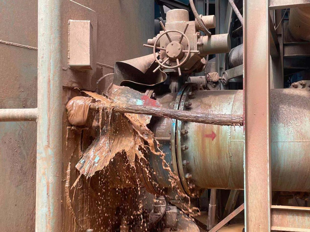 6月24日早上5:50分攀藍(lán)鼎3燒脫硫系統(tǒng)1號(hào)循環(huán)泵旁吸收塔塔壁原穿孔位置玻璃鋼防腐材料突然脫落,導(dǎo)致吸收塔內(nèi)部漿液噴涌而出。3燒崗位人員張仕虎,立即將情況匯報(bào)至班長(zhǎng)蘭華春處,蘭華春立即從庫(kù)房領(lǐng)取破布至三燒現(xiàn)場(chǎng),6:05分蘭華春到達(dá)三燒現(xiàn)場(chǎng),經(jīng)過(guò)查看腐蝕穿孔情況,在嘗試使用破布堵塞無(wú)果后,6:10分將腐蝕穿孔情況匯報(bào)至設(shè)備管理主管劉武處,6:12分將情況匯報(bào)至生產(chǎn)部副部長(zhǎng)王森林處,同時(shí)要求中控開(kāi)始降低吸收塔液位。6:16分王森林立即將相關(guān)情況匯報(bào)至生產(chǎn)部部長(zhǎng)崔偉處。