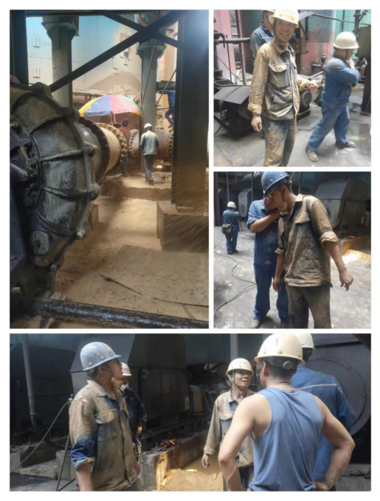 通過各負(fù)責(zé)人現(xiàn)場對(duì)故障情況分析,1#循環(huán)泵泄漏在可控范圍內(nèi)區(qū)域地坑可實(shí)現(xiàn)全收集。2#泵進(jìn)口閥門故障是備用循環(huán)泵長期未使用導(dǎo)致閥門卡阻。生產(chǎn)部立即組織對(duì)2#循環(huán)泵閥門進(jìn)行搶修,檢修班長帶頭,頂著漿液沖到事故點(diǎn)開始搶修。