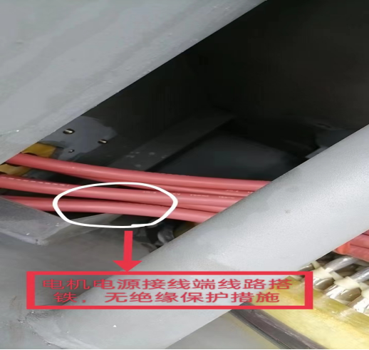 9月8日上午檢修電儀負(fù)責(zé)人周福和互保對子朱江華正常巡視到球團(tuán)脫硝增壓風(fēng)機(jī)處時(shí),施工人員正準(zhǔn)備對風(fēng)機(jī)電機(jī)頂部進(jìn)行封蓋。出于職業(yè)的本能反應(yīng),兩人快速對封蓋前的風(fēng)機(jī)電機(jī)內(nèi)部進(jìn)行最后一次安全檢查,檢查發(fā)現(xiàn)風(fēng)機(jī)內(nèi)部兩處重大設(shè)備安全隱患。第一、高壓電機(jī)電源端線路直接緊靠在金屬棱角邊緣,風(fēng)機(jī)電機(jī)屬于高壓大功率設(shè)備,在運(yùn)行中受到煙氣流量流速,壓力喘振等因素會產(chǎn)生振動,如果電源線不進(jìn)行絕緣處理長時(shí)間運(yùn)行,會導(dǎo)致絕緣外皮破損產(chǎn)生搭鐵短路放炮事故。