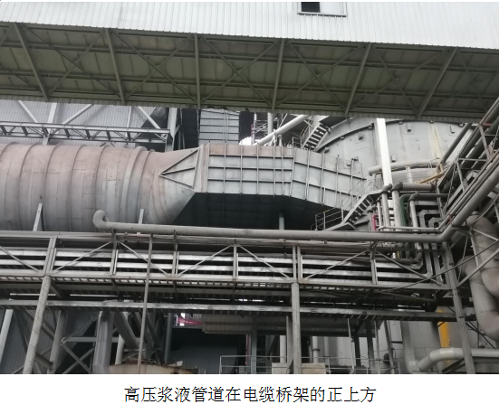 西昌藍(lán)鼎超低排放項(xiàng)目的電纜橋架和漿液管道同在一個(gè)門型鋼架上,而且高壓漿液管道處于電纜橋架的正上方,一旦發(fā)生高壓管道爆裂,高壓溶液噴射到電纜上,有可能會(huì)造成電纜沖破皮產(chǎn)生短路放炮事故。