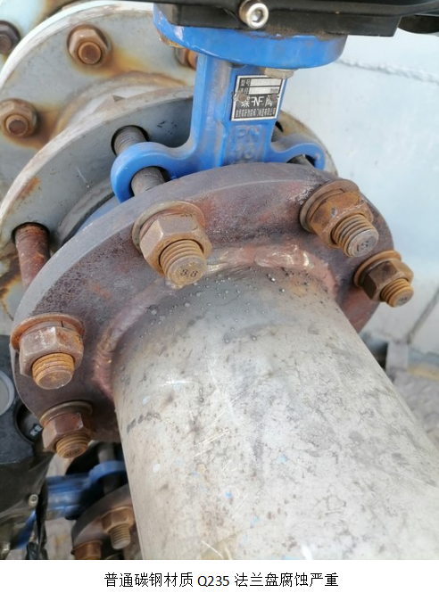 西昌藍(lán)鼎一、二期脫硫脫硝系統(tǒng)已經(jīng)連續(xù)運(yùn)行了兩年,脫硫脫硝出口指標(biāo)達(dá)到國家超低排放標(biāo)準(zhǔn)。但是部份機(jī)電設(shè)備腐蝕嚴(yán)重,比如主副塔的除霧器沖洗水管道法蘭盤材質(zhì)為普通碳鋼Q235,有部分法蘭盤已經(jīng)出現(xiàn)漏水故障,水噴到電機(jī)上可能將電機(jī)燒壞,跑冒滴漏也會(huì)被罰款,存在安全隱患。