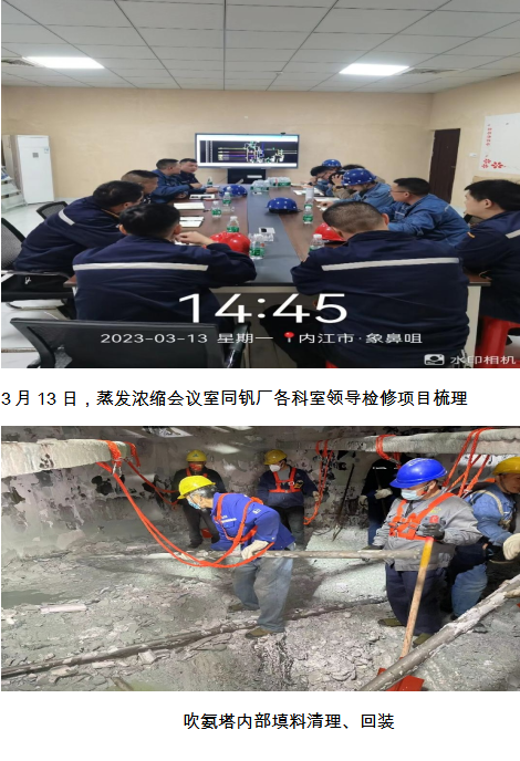 威遠(yuǎn)藍(lán)鼎提釩廢水處理和蒸發(fā)濃縮項(xiàng)目,自去年10月份停機(jī)大修至今已有近半年時(shí)間。運(yùn)行過程中水處理吹氨塔填料堵塞漏蒸汽,蒸發(fā)濃縮各單元設(shè)備故障明顯增加,影響系統(tǒng)運(yùn)行。威遠(yuǎn)藍(lán)鼎在釩廠回轉(zhuǎn)窯大修期間,提前消減廢水庫存至3000m3以下,避免廢水外送高爐。3月13日威遠(yuǎn)藍(lán)鼎副總經(jīng)理黃安軍、副部長楊平、宋雨鵬在蒸發(fā)濃縮會議室組織釩廠各科室開展檢修協(xié)調(diào)會,告知釩廠相關(guān)領(lǐng)導(dǎo)本次檢修項(xiàng)目的重點(diǎn)、難點(diǎn)、風(fēng)險(xiǎn)點(diǎn),為水處理爭取充足的檢修時(shí)間。