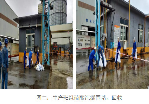 本次演練模擬硫酸卸車泵房硫酸管道泄漏,14:00當(dāng)班兩名酸堿工巡查酸堿管網(wǎng)時(shí)發(fā)現(xiàn)酸堿卸車區(qū)閥門滲漏;現(xiàn)場人員立即通知當(dāng)班班長,班長立即組織人員準(zhǔn)備急救物資;14:02當(dāng)班班長趕到現(xiàn)場查看滲漏情況后立即組織人員用應(yīng)急沙進(jìn)行圍堵并安排人員拉好警戒線維持好現(xiàn)場次序;14:03當(dāng)班班長將情況匯報(bào)調(diào)度室,同時(shí)通知檢修到場,調(diào)度室第一時(shí)間通知安全環(huán)?;14:05檢修到現(xiàn)場確認(rèn)情況,制定出檢修方案并開始檢修,同時(shí)現(xiàn)場監(jiān)護(hù)人員確認(rèn)檢修防護(hù)用品是否穿戴完整;14:15經(jīng)過檢修搶修后現(xiàn)場試車確認(rèn),無滲漏,匯報(bào)相關(guān)領(lǐng)導(dǎo)同時(shí)把地面污染物進(jìn)行清理;14:25經(jīng)過相關(guān)領(lǐng)導(dǎo)確認(rèn)后,無滲漏,同意恢復(fù)生產(chǎn);14:28匯報(bào)調(diào)度,調(diào)度室通知恢復(fù)正常生產(chǎn)。