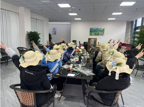 上午11時(shí),創(chuàng)意手作環(huán)節(jié)在藍(lán)鼎茶坊開展,F(xiàn)場(chǎng)備有純色草帽及永生花、絲帶等裝飾材料,女員工們精心挑選花材,巧妙構(gòu)思造型:有的將向日葵與康乃馨錯(cuò)落點(diǎn)綴成環(huán)形花冠,有的用絲帶編織出立體蝴蝶結(jié)裝飾。大家邊制作邊交流配色心得,互相挑選合適的花朵、協(xié)助粘貼花材。“通過團(tuán)隊(duì)協(xié)作完成作品,讓我們感受到了自己動(dòng)手創(chuàng)造帶來的快樂。”一位參與者如是說。