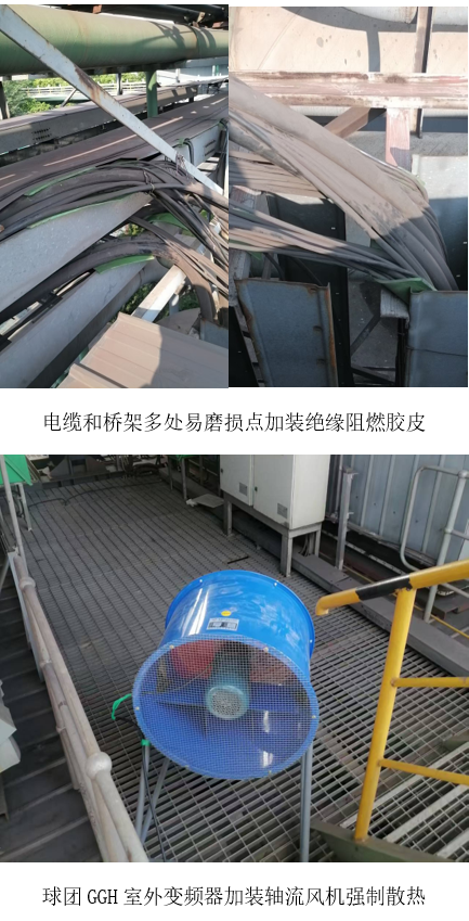 首輪排查聚焦公輔系統(tǒng)電纜橋架。電氣人員發(fā)現(xiàn)電纜與橋架金屬棱角存在外力磨損風(fēng)險,立即在多處易磨損點加裝絕緣阻燃膠皮,實現(xiàn)“以柔克剛”,杜絕短路及火災(zāi)隱患。隨后,針對球團GGH室外變頻器柜散熱不良問題,技術(shù)人員加裝一臺大功率軸流風(fēng)機,強制排熱,柜內(nèi)溫度由58 ℃降至43 ℃,保障變頻器長周期穩(wěn)定運行。